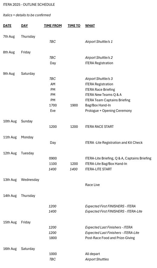 The outline schedule for ITERA and ITERA-Lite 2025 is indicated below. This is subject to change, In particular the -Lite race registration and briefing process is likely to be held on Monday 11th Aug. The start time of both races is not confirmed at this stage.